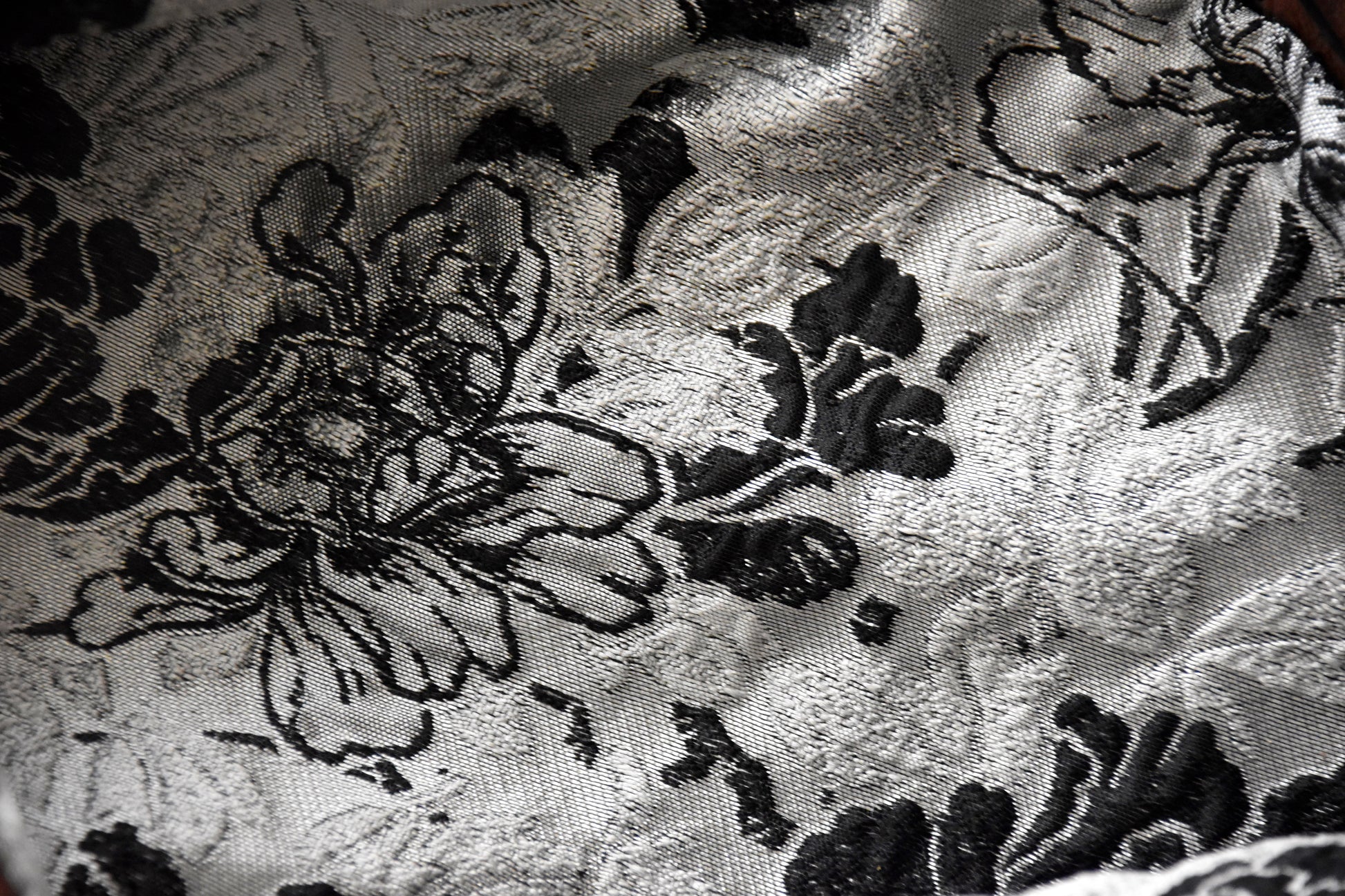 Vegan leather shell, paired with a floral, gray jacquard interior. Close it off with a continuous zipper & brass zipper pull.